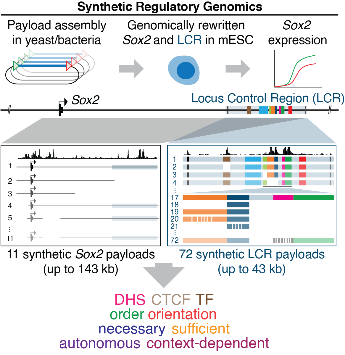 SOX2 is part of a core regulatory network of transcription factors required for embryonic stem cell (ESC) pluripotency maintenance and cellular reprogramming. Expression of Sox2 in mESC depends on a distal cluster of DHSs located ~100 kb away, but their individual contributions and interplay remain elusive. We analyzed the endogenous Sox2 locus using Big-IN to scarlessly integrate large DNA payloads incorporating deletions, rearrangements, and inversions affecting single or multiple DHSs, as well as surgical alterations to transcription factor (TF) recognition sequences. We found that two DHSs comprising a handful of key TF recognition sequences were each sufficient for long-range activation of Sox2 expression. In contrast, three nearby DHSs were entirely context-dependent, showing no activity alone but dramatically augmenting activity of the autonomous DHSs. Our results highlight the role of context as a modulator of genomic regulatory element function, and our synthetic regulatory genomics approach provides a roadmap for dissection of other genomic loci.